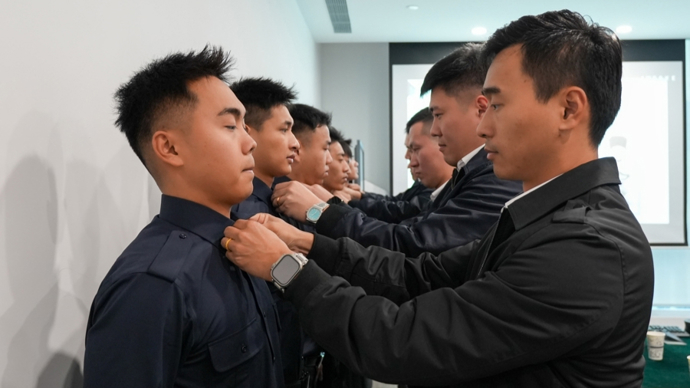春秋航空秉承“传帮带”的优良传统,从众多员工中精心挑选出业务能力出众、口碑载道的资深员工,担任这批安全学员的带教师父。通过这种“以老带新”的教学模式,帮助员工更快成长,更激发了队伍的活力与创造力。作为带教师父代表,驻港部队退伍军人、春秋航空首批安全员许申圣承诺:“我们会把特勤处置的每一个细节、安保执勤的每一项准则,毫无保留地传给徒弟们。”