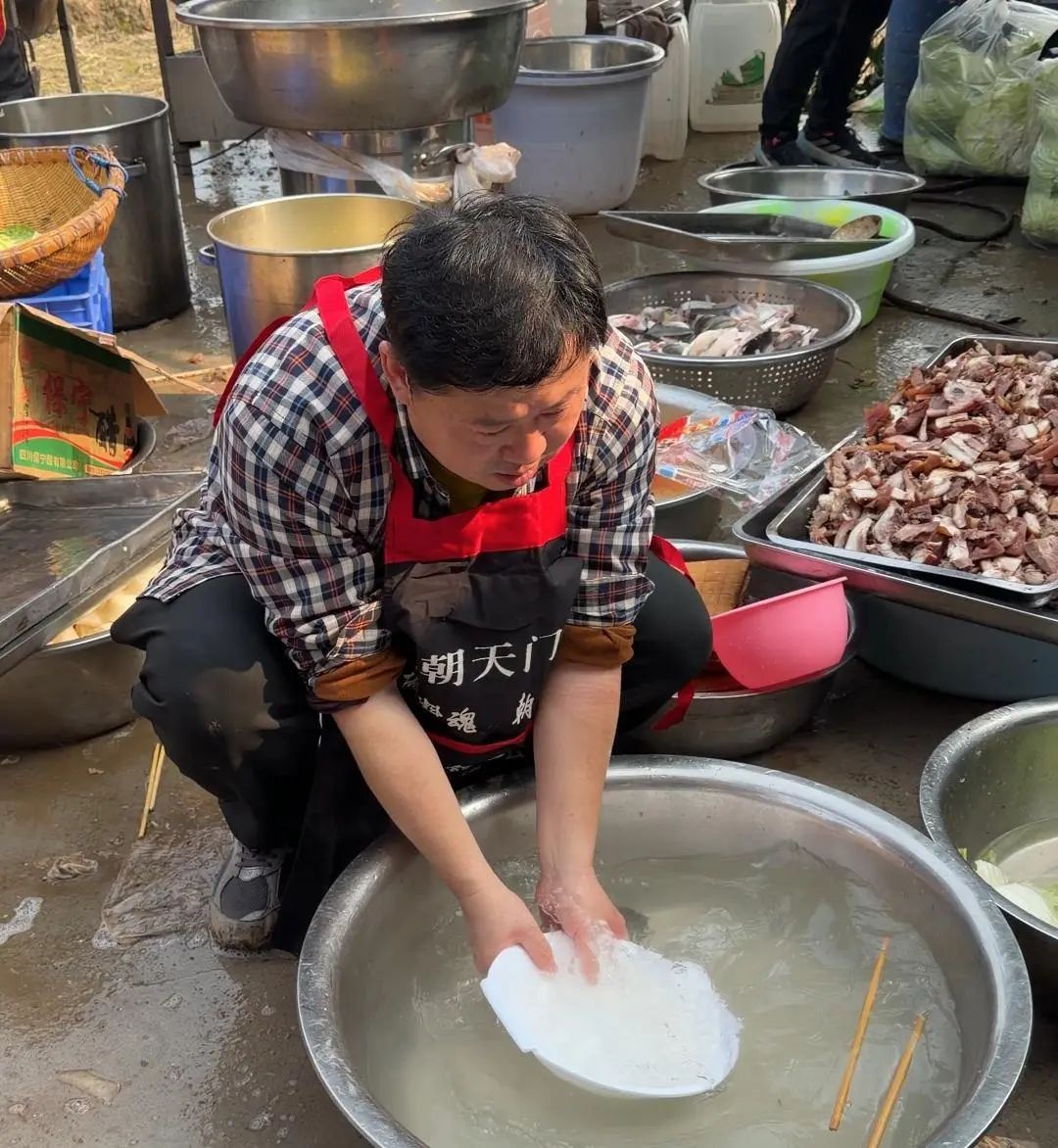 两天时间里,卤鹅哥默默用行动支持着这个“后辈”,不停穿梭在院坝和厨房之间。当热闹散去,他和广大志愿者、工作人员一起,躬下身子一点一点做着清洁,直到1月13日凌晨两点才悄悄离开。