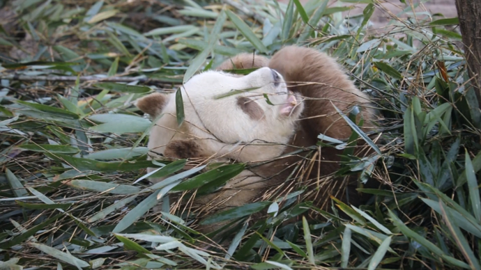 在位于陕西西安的秦岭大熊猫研究中心,棕色大熊猫“七仔”正在享受冬日时光。