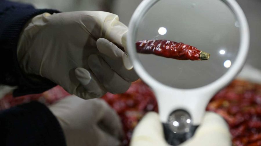 作为海关一线的“老兵”,张晓欣将自己的工作比喻为“给植物旅客做全面体检”。集装箱门打开瞬间,浓烈醇厚的辛辣气息扑面而来。这批自然晾晒的辣椒色泽红亮,但他并未被表象吸引——开箱、取样、过筛、细查,动作干净利落。随后,他蹲下身,将放大镜贴近筛网,如同精准的雷达,在辣椒褶皱与筛落物中仔细排查。