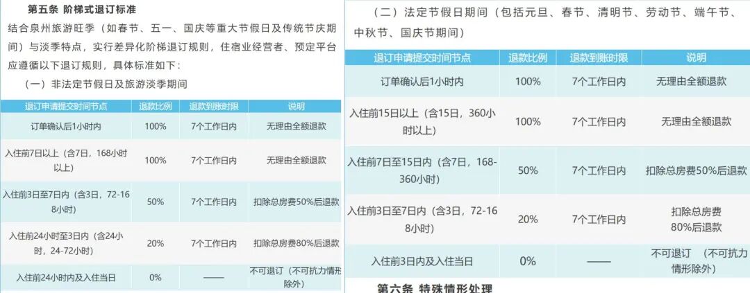 1月15日,泉州旅游协会通过公众号发布了上述指导意见。其中“阶梯式退订标准”显示,非法定节假日及旅游淡季期间,住宿订单确认后若要取消,在入住前7天以上取消可全额退款,7天内取消会相应扣除房费。具体扣除标准是,入住前3天至7天取消订单,扣除房费50%;入住前24小时至3天内取消订单,扣除房费80%;入住前24小时内及入住当天,不可退订。春节、劳动节、国庆节等法定节假日期间更为严格,取消订单全额退款的门槛为入住前15天以上,入住前7天至15天取消将扣除房费50%、入住前3天至7天取消将扣除房费80%、入住前3天及入住当天不可退订。