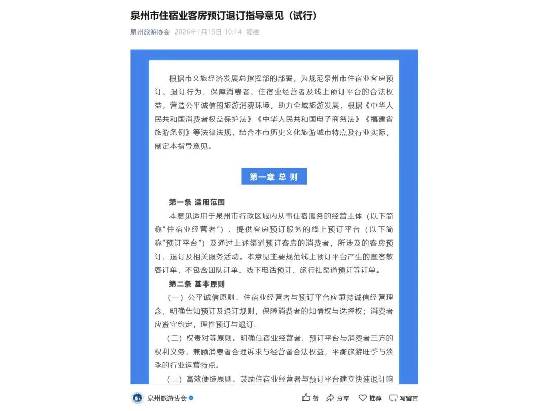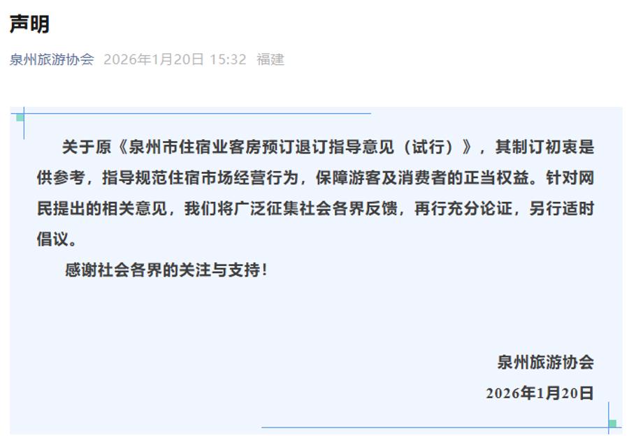 1月20日,泉州旅游协会发布声明:关于原《泉州市住宿业客房预订退订指导意见(试行)》,其制订初衷是供参考,指导规范住宿市场经营行为,保障游客及消费者的正当权益。针对网民提出的相关意见,我们将广泛征集社会各界反馈,再行充分论证,另行适时倡议。