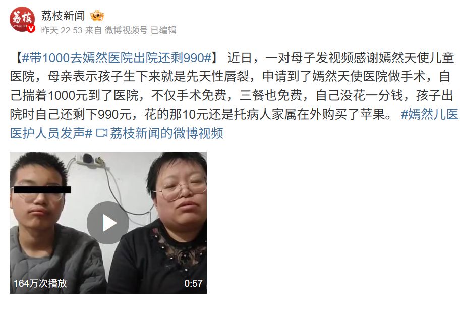 此外,一对母子也发视频感谢嫣然天使儿童医院。母亲表示孩子生下来就是先天性唇裂,申请到了嫣然天使医院做手术,自己揣着1000元到了医院,不仅手术免费,三餐也免费,没花一分钱,孩子出院时还剩下990元,花的那10元还是托病人家属在外购买了苹果。
