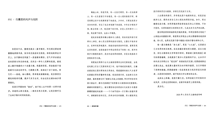 《逆风的行囊》是一次暗藏光环的写作。它借着行走来审视停顿,通过出发来实现到达;它以轻盈来诠释重量,以缓慢来抵抗迅速;它在给予中收获,在接纳中馈赠……如作者在后记中所说的那样,“人生最远的旅行,并非抵达某个地理的终点,而是历经跋涉之后,最终走回自己内心深处的那段归途”。这样的观点,曾被以及正在被无数人实践着,《逆风的行囊》提供了一幅实践的路线图,循此路径,或可助读者更易叩问内心,寻回心灵的故乡。