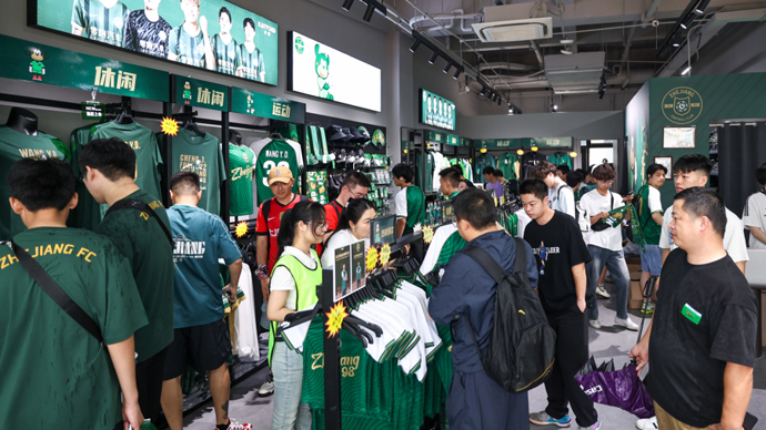 球迷在位于杭州黄龙体育中心内的浙江俱乐部官方商店购物 图片来源:新华社