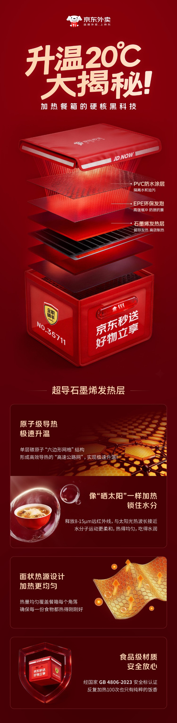 据了解,京东外卖加热餐箱相较普通餐箱,可实现配送温度升温20℃,关键源于其科技配置。餐箱内的超导石墨烯发热层,在实现极速升温的同时,仍能像“晒太阳”一样柔和加热;不同于传统加热丝,石墨烯发热层的面状热源设计,能让热量均匀覆盖餐箱每个角落,确保每一份食物都热得刚刚好;并且,箱体食品级材质均符合国标,保障反复加热后也无异味,只有原汁原味的饭菜香。