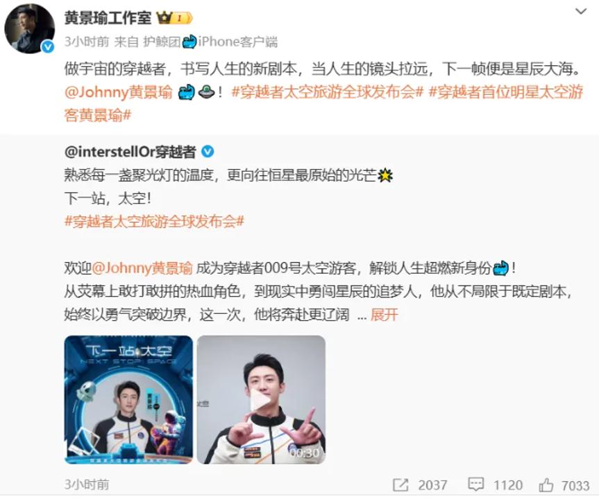 1月22日,@interstellOr穿越者 官宣@Johnny黄景瑜 成为009号太空游客,黄景瑜在vcr中表示很荣幸成为一名太空旅客,将乘坐中国人自己的飞船亲身抵达那片星海。