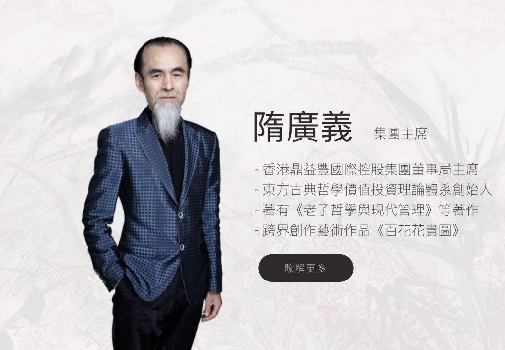 据鼎益丰官网此前介绍,隋广义于1962年出生于吉林省长春市,1994年曾担任东北某市最年轻的副市长,集商、政、国学研究经历及背景于一身。1997年隋广义弃官修行,历经多年创立了“禅易投资法”“东方古典哲学价值投资理论体系”。2011年创立鼎益丰并出任董事长,创立之初集团只有3人,到现在已经有上万名员工。其中,香港鼎益丰国际控股集团成立于2011年1月,注册资本5.81亿,目前管理资产累计超1000亿港币