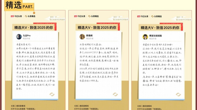 今日头条相关负责人表示,《2025头条精选年鉴》的升级核心是回归内容本质与用户情感。希望通过作者来信等创新形式,让优质内容被看见,让创作者与读者双向奔赴,让更多人发现头条的好作者与好内容。未来,今日头条将持续加码优质内容扶持,深化作者与用户的互动链接,不断完善内容生态,让平台成为更多用户记录生活、获取新知、收获共鸣的重要阵地,与千万用户一同在2026年看见更大的世界。