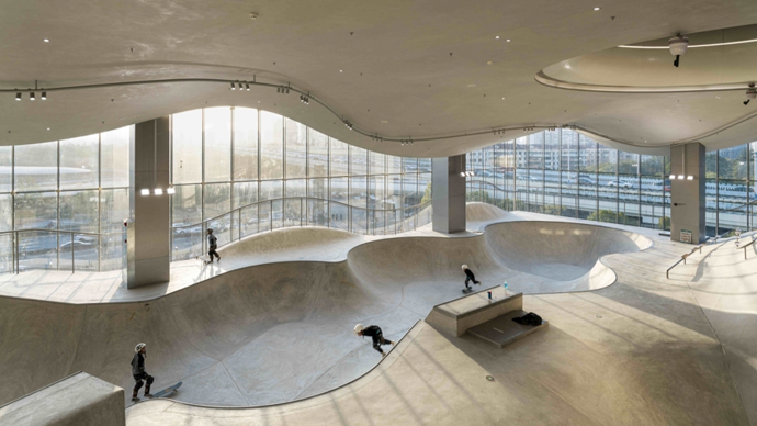 自然元素成为空间设计的亮点。“云”“瀑”“石”“峰”“谷”“森”等自然意象转化为可体验的建筑场景,如:位于商场三楼的滑板空间是一个室内外过渡空间,以流畅起伏的曲面设计模拟云朵的轻盈。