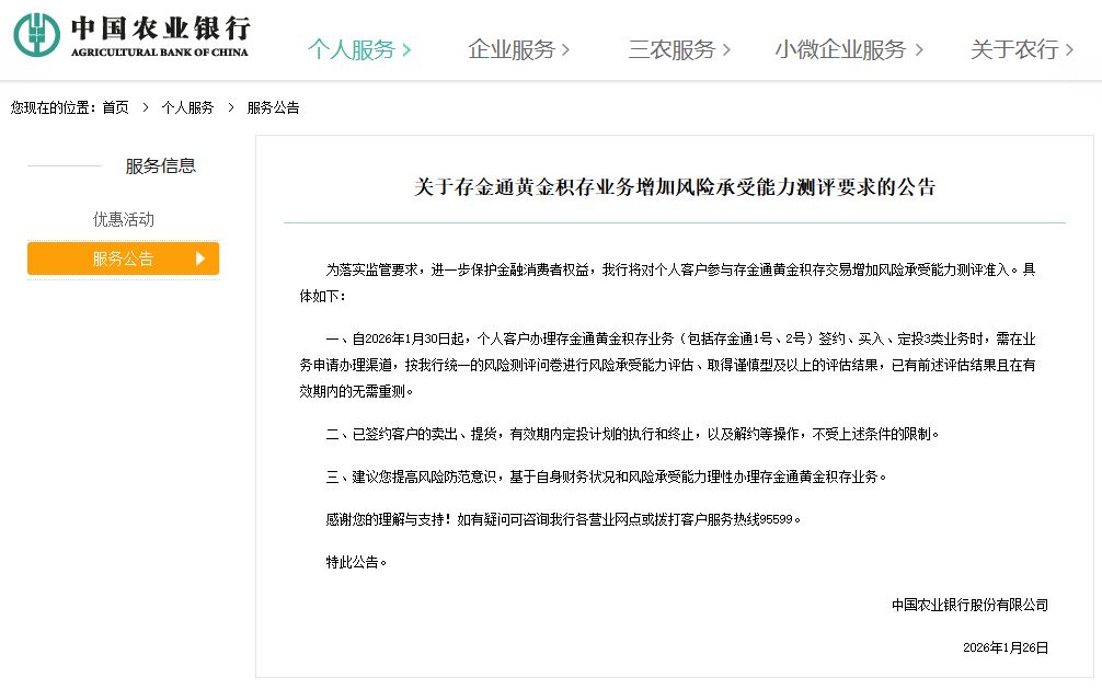1月26日,农业银行发布公告,称将对个人客户参与存金通黄金积存交易增加风险承受能力测评准入。