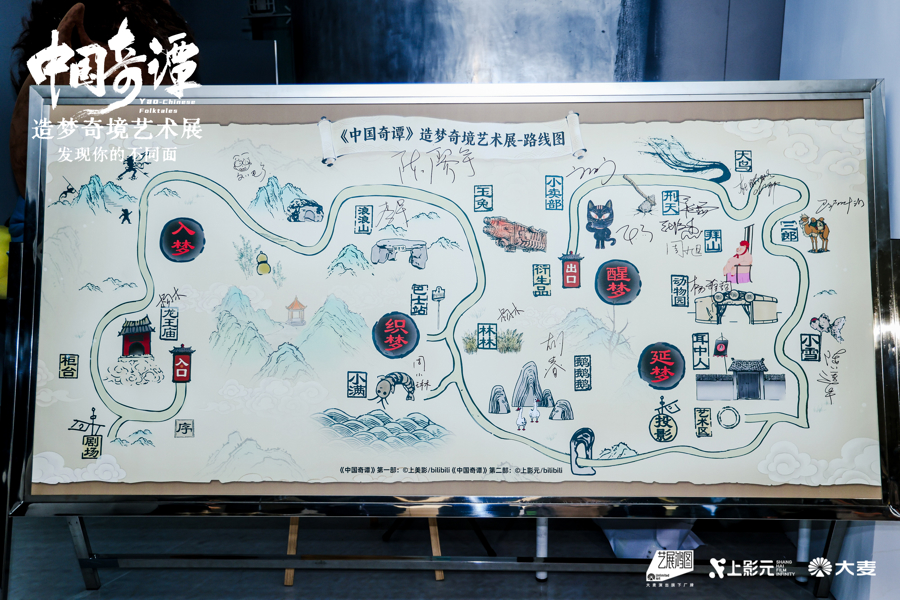 为营造沉浸式的观展体验,“梦境”成为策展主线,并通过“入梦—织梦—延梦—醒梦”四个篇章的主题设置打造行业内首个“入梦式”观展线索IP艺术展。观众步入展厅后,即可在《如何成为三条龙》中的龙王庙前抽取“好运签”。随后“光影造梦区”即为“入梦”篇章,该展区旨在通过回溯自1957年《大闹天宫》到当前《中国奇谭》系列上美影所构筑的经典变迁,唤醒观众对中国原创动画的文化记忆;“织梦”篇章则集中呈现了《小妖怪的夏天》《玉兔》《乡村巴士带走了王孩儿和神仙》《林林》《小满》《鹅鹅鹅》《耳中人》《小雪》《今日动物园》《拜山》《三郎》《大鸟》《刑天》等十余个奇谭故事。通过与故事中角色的交互,观众可以在这里完成“问我”和“织梦”的过程;“延梦”篇章所对应的“艺术区”,陈列了多幅当代青年艺术家以东方美学为创作主题的原创作品;“醒梦”篇章与展览的衍生品商店巧妙结合,让观众穿过充满烟火气的胡同后,与《小卖部》《大贵人》温暖相遇,并通过文创衍生品和数字互动,将关于这场梦境的实体纪念带回家。