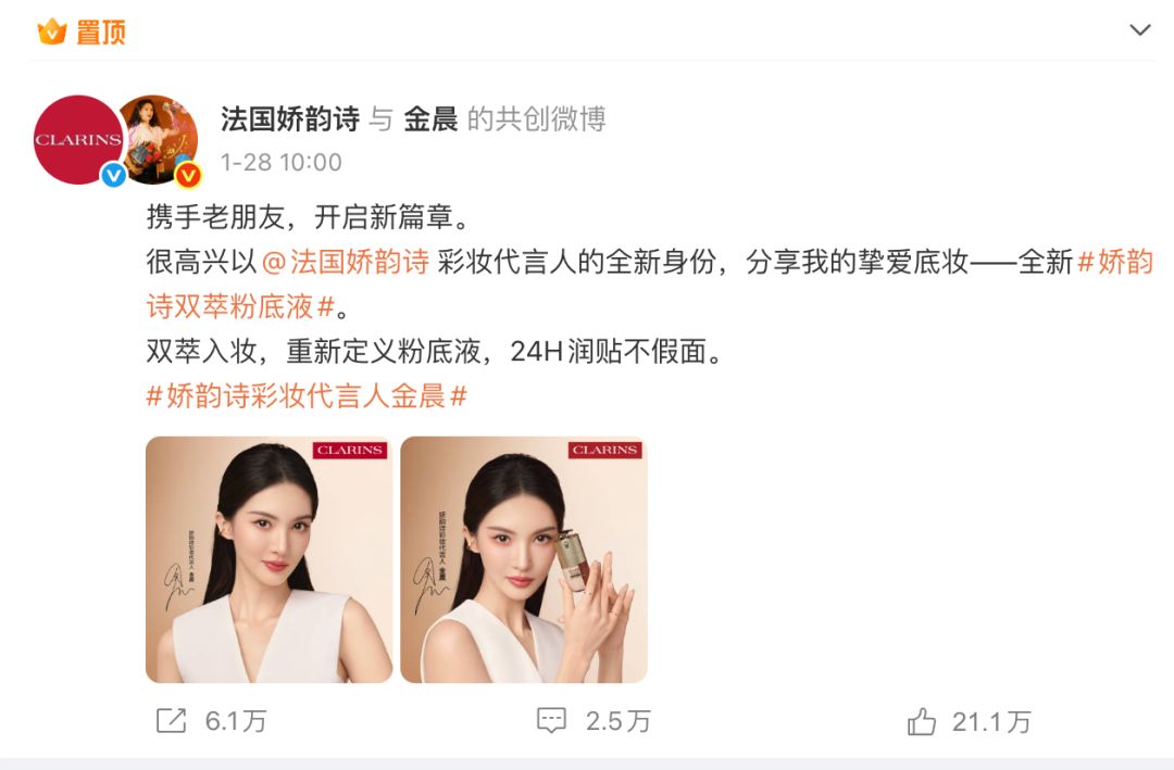 截至发稿时,娇韵诗官方微博于1月28日发文,宣布金晨成为该品牌彩妆代言人,两者的共创微博仍然在首页置顶。