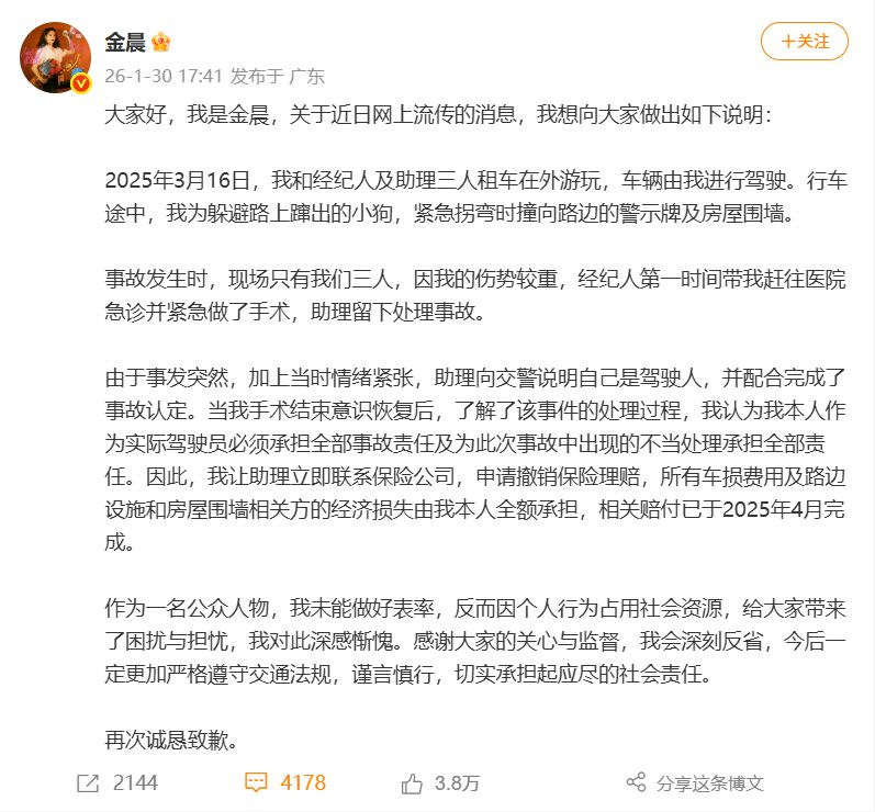 今天(1月30日),金晨就此事发布微博,全文如下: