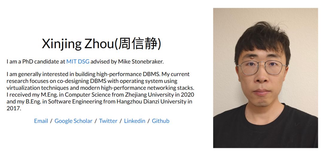 研究生期间以第一作者身份发表DPTree的工作在数据库顶级会议VLDB2020会议上。毕业后,周信静顺利就职于腾讯公司,工作之余,他从未放弃对自己热爱的数据库领域的研究,他参与的工作SpitFire发在SIGMOD2021上(SIGMOD和VLDB是数据库领域最顶级的两个会议),2020年底成功申请到麻省理工学院(MIT)的计算机博士(CSPhD),成为了数据库领域图灵奖获得者 Mike Stonebraker 的学生。