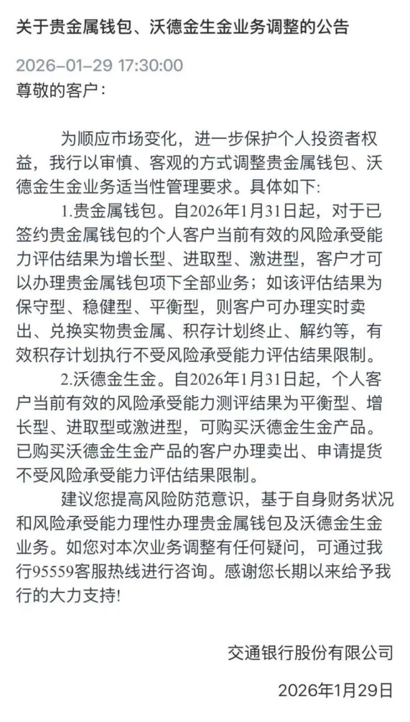 交通银行于1月29日发布公告称,自1月31日起,对于已签约贵金属钱包的个人客户,当前有效的风险承受能力评估结果为增长型、进取型、激进型,才可以办理贵金属钱包项下全部业务;如该评估结果为保守型、稳健型、平衡型,则客户可办理实时卖出、兑换实物贵金属、积存计划终止、解约等,有效积存计划执行不受风险承受能力评估结果限制。