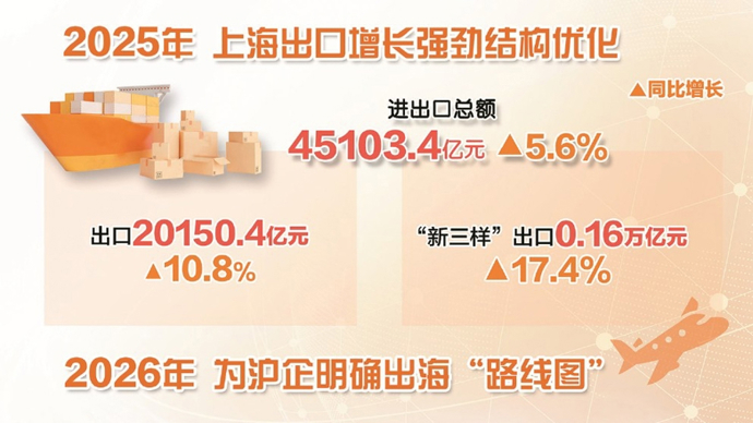 来自市商务委的数据显示,上海2025年进出口总额45103.4亿元,同比增长5.6%,出口20150.4亿元,同比增长10.8%,两项指标均创历史新高,其中“新三样”出口0.16万亿元,同比增长17.4%,出口结构持续优化。
