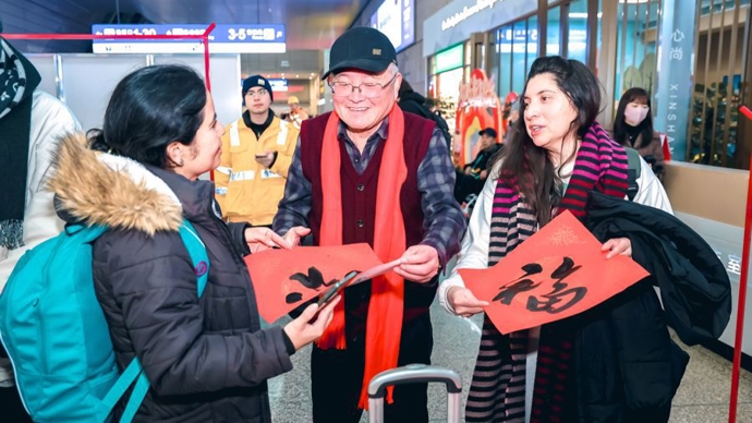 在出发层的“翰墨迎春”区域,书法家们挥毫泼墨,将一幅幅寓意吉祥的春联和“福”字赠予旅客。“没想到赶火车还能收到手写春联,年味一下子浓了!”正准备回湖南老家的李女士手捧一张大大的“福”字笑道。