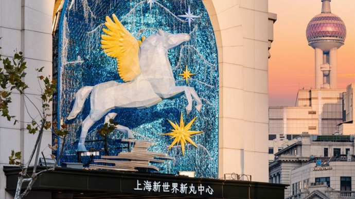 值得一提的是,商业与文化交融,为新春消费注入独特韵味。商场全新推出马年大型艺术装置《星翼丙午》,以二十八星宿中的“星日马”为原型,将古老星象符号与现代设计结合,打造兼具未来感与神圣感的公共艺术作品。该装置高逾四米,采用低多边形造型语言,主体为“星空蓝”,翅膀渐变为“晨曦橙”,内置光源夜间自内而外发光,与城市霓虹交相辉映,成为沪上新年打卡新地标,让市民在购物之余,感受马年新春的文化气息。