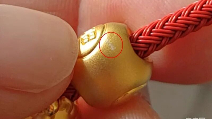 近日,广东清远的李女士向央广网啄木鸟消费者投诉平台反映,她新购买的周生生足金福袋挂坠佩戴一天后即被刮花,并出现白色痕迹。