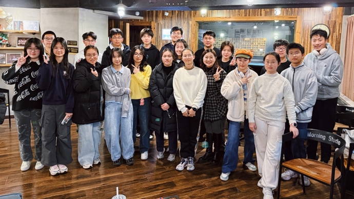 徐晨(前排右3黑色格子衫)和同学们一起走进录音棚