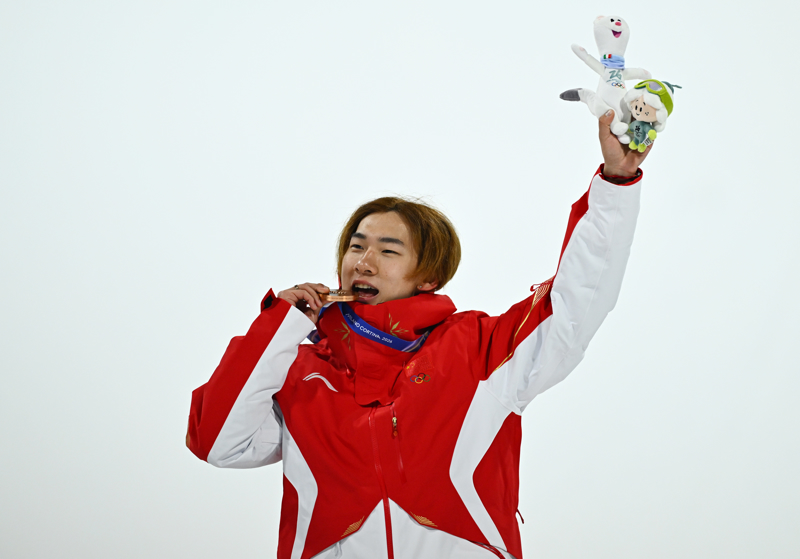 2月7日,季军中国选手苏翊鸣在颁奖仪式上。
