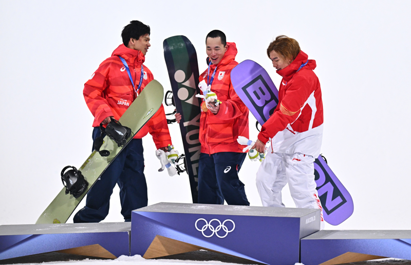 2月7日,冠军日本选手木村葵来(中)、亚军日本选手木俣椋真(左)和季军中国选手苏翊鸣在颁奖仪式上。
