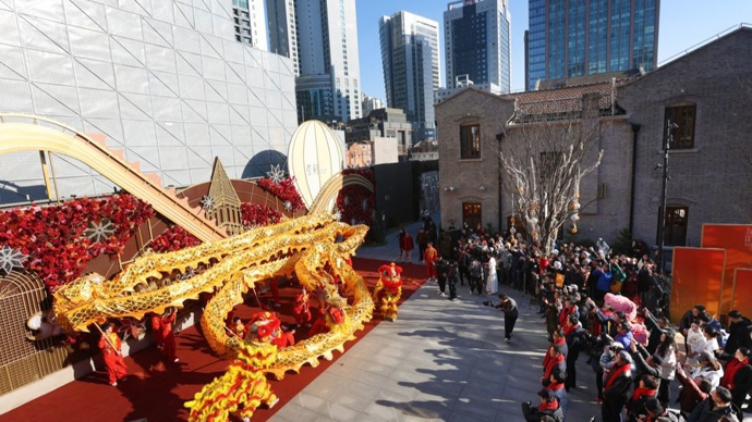 2月8日启幕仪式上,中国龙狮九段、国家级非遗传承人陆大杰领衔龙狮献瑞,以“骏驰龙腾”之势巡游茂名北路;被誉为“最优美的中国乐团”上海民族乐团,在安垲第艺术墙前奏响经典曲目,非遗丝竹管弦勾勒出一幅生动的海派音画。在12号楼广场前,上海市书法家协会主席丁申阳、非遗撕纸传承人华兴富、版画艺术家金雯等亲临现场,传统技艺在指尖重生,重现张园历史上“游园观艺”的雅趣盛景。
