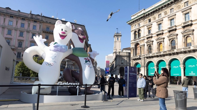2025年2月6日,在意大利米兰,人们经过2026年米兰-科尔蒂纳丹佩佐冬奥会、冬残奥会吉祥物。