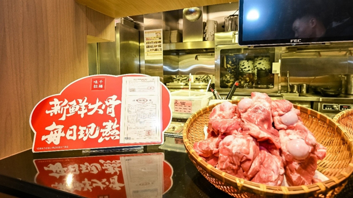 为此,公司花费数月建立新供应链,并与国内大骨供应商建立直接合作。同时,重新设计门店厨房动线和熬汤流程。如今,在试点的近铁广场门店,可以看到新鲜大骨长达3小时的熬制全过程。店内还展示了大骨供应商信息、动物检疫合格证明及质量检测报告,并以海报形式展示菜品的配送时长和店内存放时长。此外,海报上每道菜品旁,还明确标注“店内新鲜制作”或“中央厨房半预制”。目前,味千新品“超级大骨肉拉面”已通过市场初步检验。