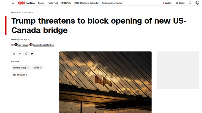 原标题:《加拿大省长:不能屈从于白宫压力,加美跨国大桥“定会通车”》