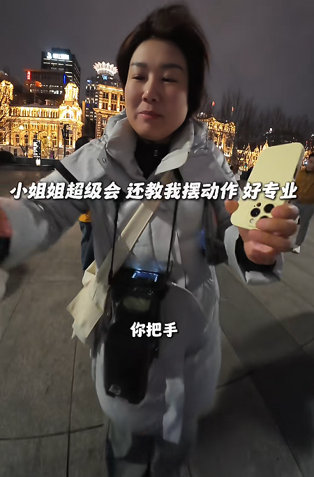 一位路人小姐姐得知“博主想要拍一张外滩风景照后,毫不犹豫地提供帮助。