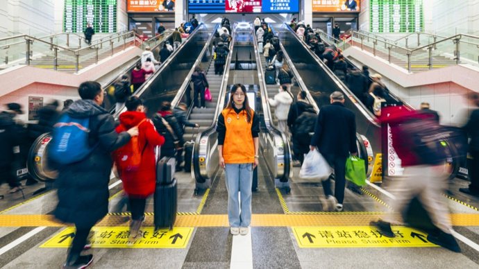 在上海站春运一线,上海大学第13批研究生支教团成员黄焱堰已连续4年“满勤”参与春运志愿服务。重点旅客服务岗位上,他主动背起旅客行李,化身视障旅客的“眼睛”,贴心护送对方穿过人潮、顺利抵达车厢铺位,细致帮扶“橙心橙意”。