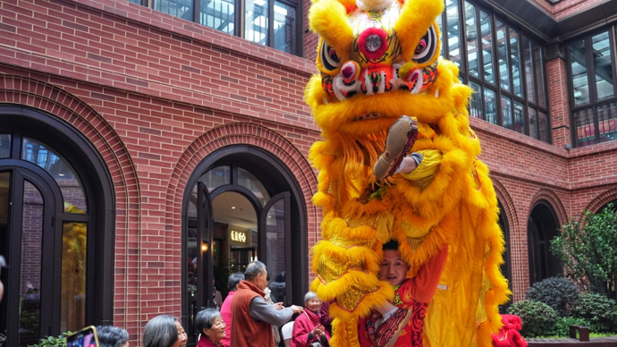 清晨九点半,舞狮的鼓点在太保家园静安社区中庭响起。今天(2月15日)是上海的小年夜,金红相间的醒狮昂首腾跃,锣鼓铿锵。听到动静,老人们纷纷从房门探出身子,有的披着外套就往中庭赶,还有人举着手机录像,“待会我要发给女儿看!”