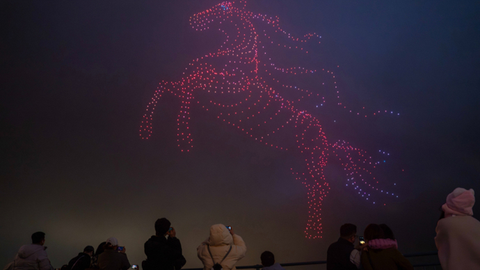 原标题:《【场面】巨型“彩马”驰骋上海夜空 上千架无人机浪漫烟花交相辉映》