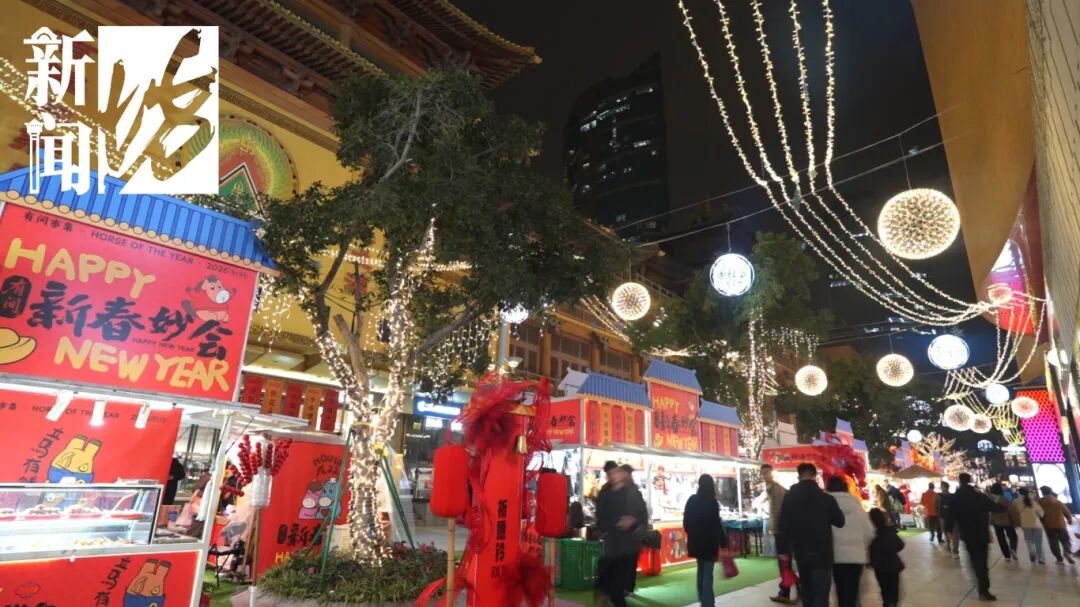 久光步行街的灯帘装饰与新春市集连成一片,光影与烟火气相映成趣。