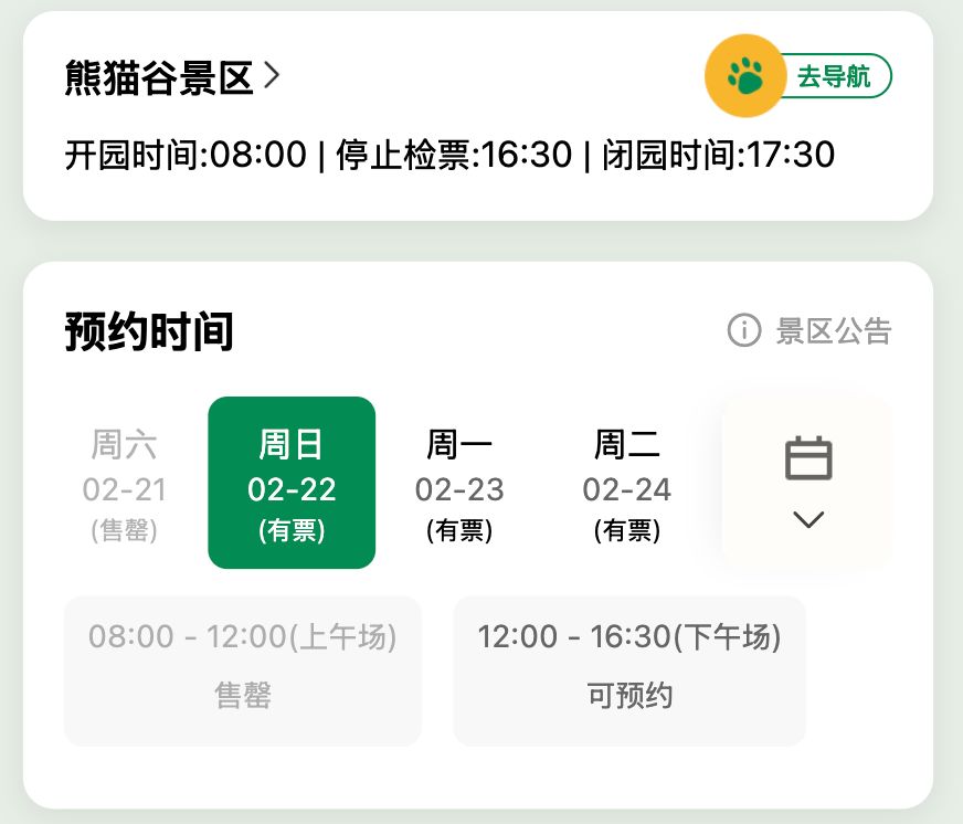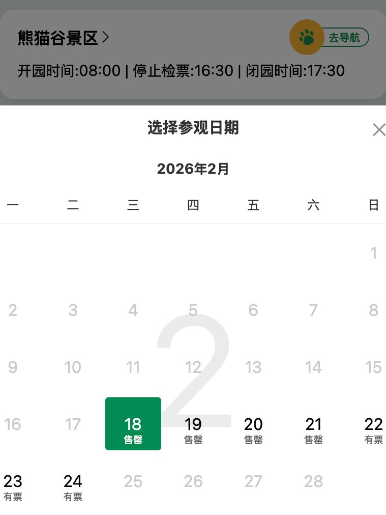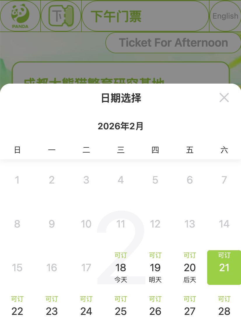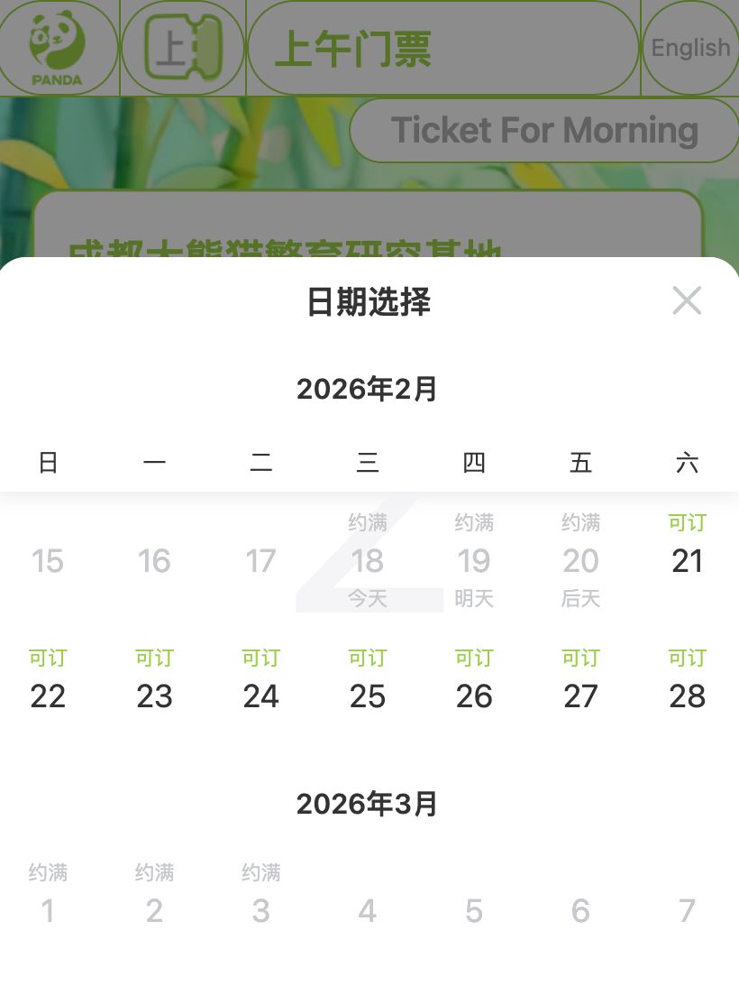 据成都大熊猫繁育研究基地购票小程序,2月18日、2月19日、2月20日上午门票已约满。
