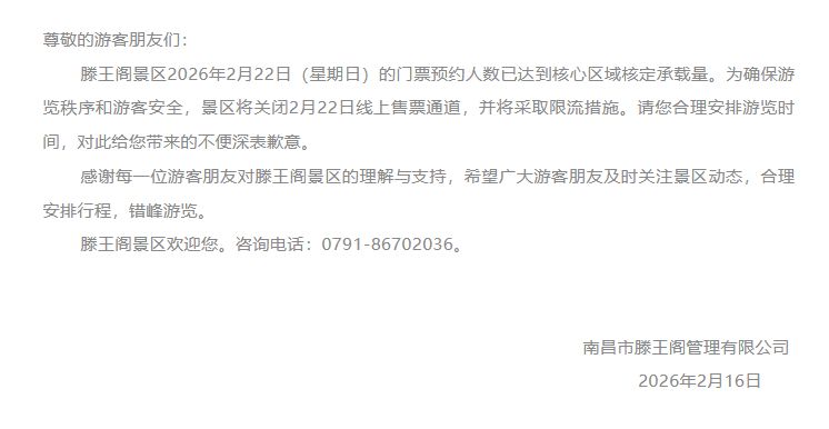 据景区官方公告显示,22日当天,滕王阁景区门票预约人数已达到核心区域核定承载量。为保障游览秩序和游客安全,景区已正式关闭2月22日线上售票通道,并将采取限流措施。