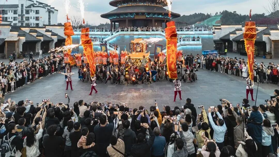 晒冬红辣椒、玉米、腊肉搭配徽派古村红灯笼,年味十足,同时还有非遗抬阁、板龙灯巡游等民俗表演,春节限流严格,篁岭景区将在春节假期期间全面实行“分时段预约购票限流管理”。