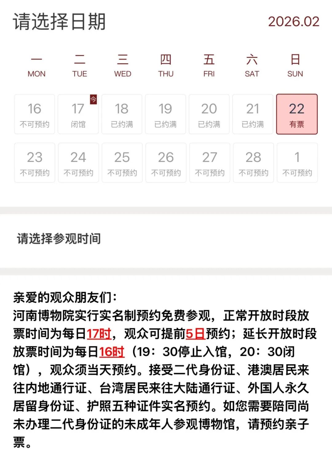 河南博物院近四天已经约满,目前,22日可预约。河南博物院实行实名制预约免费参观,正常开放时段放票时间为每日17时,观众可提前5日预约。接受二代身份证、港澳居民来往内地通行证、台湾居民来往大陆通行证、外国人永久居留身份证、护照五种证件实名预约。如您需要陪同尚未办理二代身份证的未成年人参观博物馆,请预约亲子票。