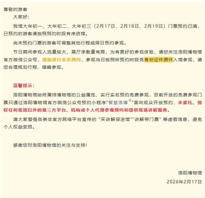 洛阳博物馆大年初一、大年初二、大年初三(2月17日、2月18日、2月19日)门票预约已满,已预约的游客请按照预约时段有序进馆。尚未预约门票的游客可调整其他行程或择日预约参观。