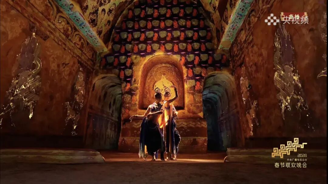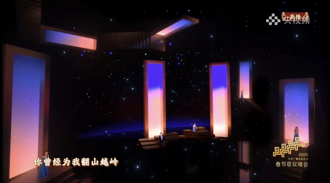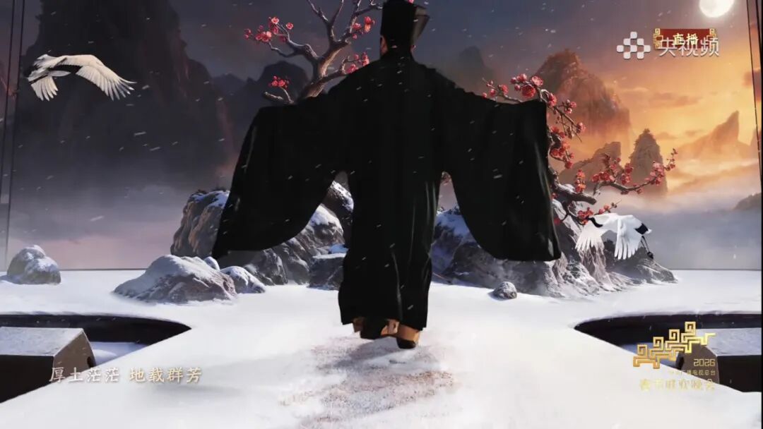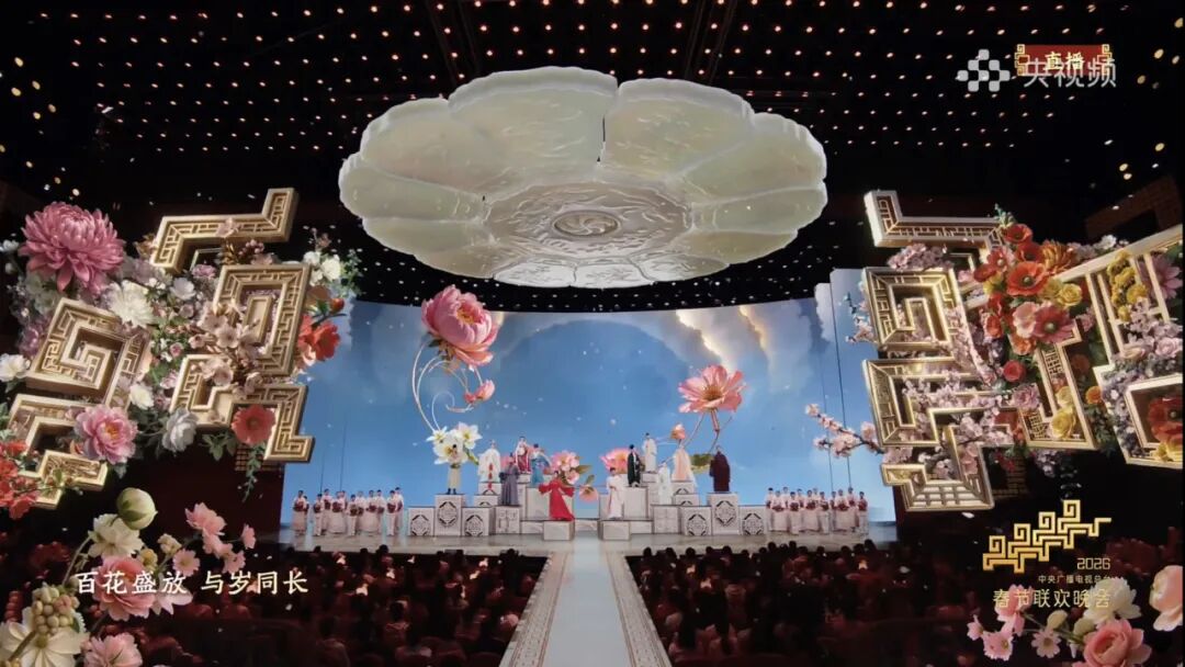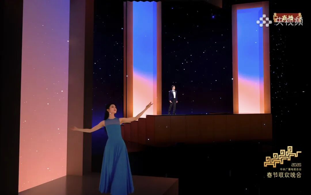 通过视觉制作在演播厅内打造更多变化的舞台效果,XR技术起到了关键作用。今年,春晚在主舞台正对面设计了一个XR舞台,12米高、5米宽的立屏也为立体影像带来更广阔的延伸空间。《丝路古韵》开场的“石窟飞天”和《智造未来》中的“宇宙畅想”,都是依托XR舞台进行延展,不仅将以往需要提前制作短片插入节目才能实现的全景特效简化为现场演绎,更为节目转场提供了更为自然的过渡方式。