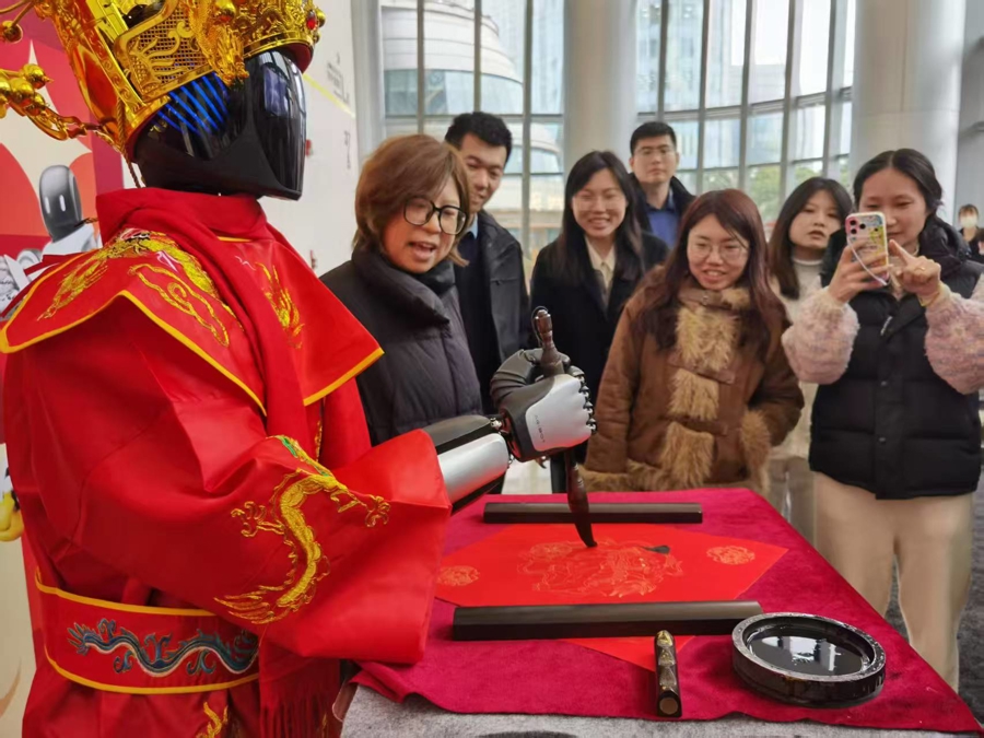 上午10点多,文汇报记者看到上海白玉兰广场办公楼入口处人群越聚越多。身着“财神”服饰的智元机器人开始展示“书法绝技”,以智能算法挥毫书写福字。不少楼内白领与市民游客掏出手机记录下全程,还纷纷上前“请”福字。