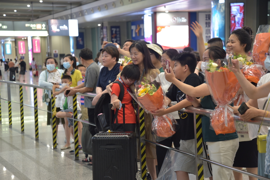运动员回国,与亲人相拥。受访者供图