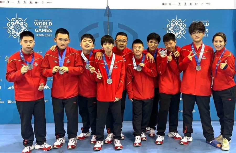 软式曲棍球教练管国良与孩子们参加第十二届世界冬季特奥会,获得银牌。