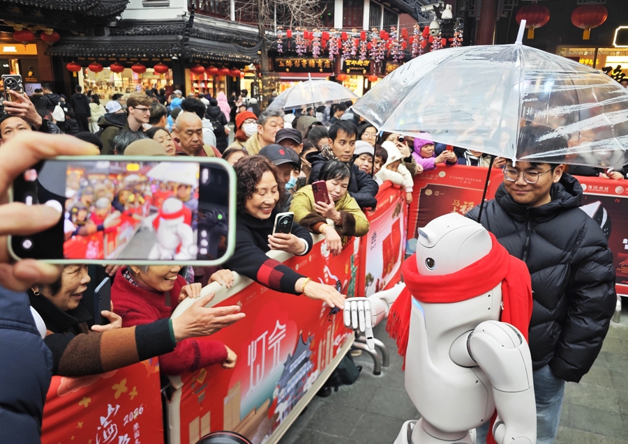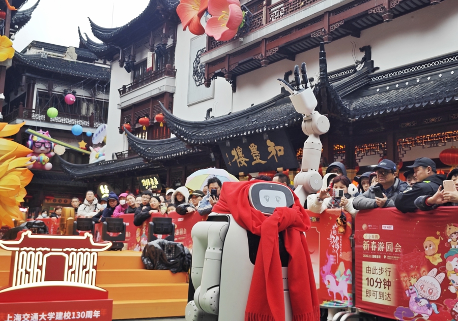 豫园九曲桥畔,人潮如织。3月2日,元宵节前夕,流光溢彩的豫园灯会拉满了科技感——非遗花灯之下,一台台具身智能机器人用灵巧手递出印有“新年好 交大运”的文创纪念品,一边展示一边与观众互动。这是上海交通大学建校130周年“以梦为马·百卅新程”亮灯仪式现场,也是大学与城市深度交融的一幕缩影。