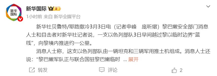 消息人士称,这支以色列部队由一辆坦克和三辆军用推土机组成。消息人士还说:“黎巴嫩军队正与联合国驻黎巴嫩临时部队协调,密切关注以色列部队动向。”