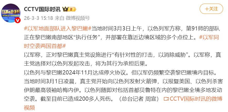 当地时间3月3日上午,以色列军方称,第91师的部队正在黎巴嫩南部地区“执行任务”,并部署在靠近边境区域的多个点位上。