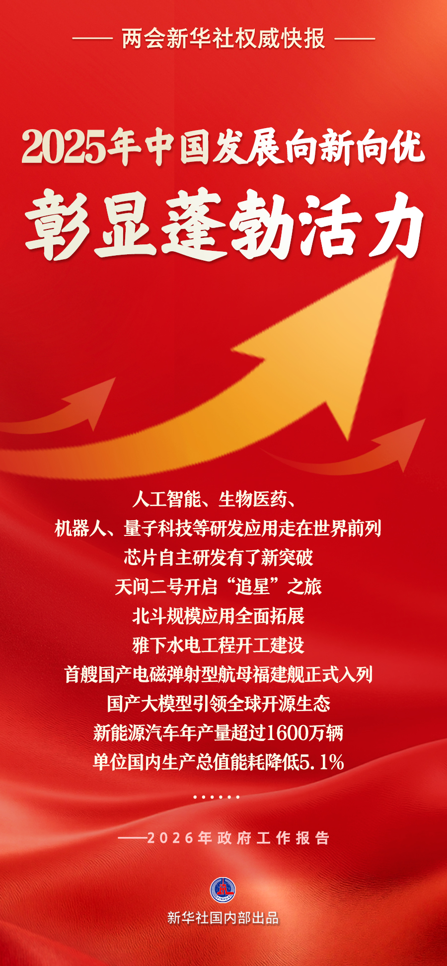 政府工作报告说,一年来,我国发展向新向优、彰显蓬勃活力。新质生产力稳步发展,科技创新成果丰硕,人工智能、生物医药、机器人、量子科技等研发应用走在世界前列,芯片自主研发有了新突破,天问二号开启“追星”之旅,北斗规模应用全面拓展,雅下水电工程开工建设,首艘国产电磁弹射型航母福建舰正式入列,国产大模型引领全球开源生态。产业结构持续优化,高技术制造业、装备制造业增加值分别增长9.4%、9.2%,工业机器人、集成电路产量分别增长28%、10.9%,新能源汽车年产量超过1600万辆,电动汽车充电设施突破2000万个。单位国内生产总值能耗降低5.1%,生态环境质量持续改善。