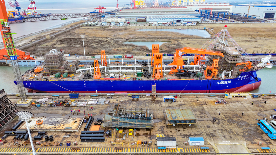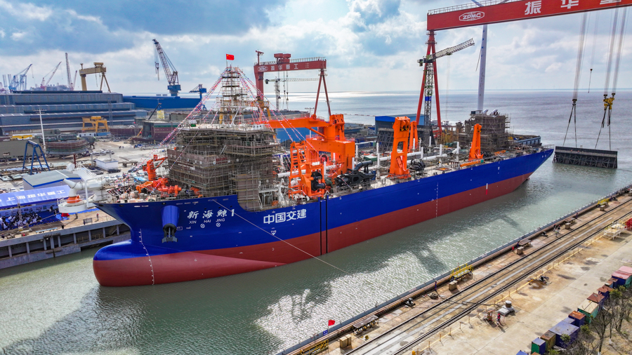 3月6日,由中交上航局投资、疏浚技术研究中心总包、中国船舶集团第七〇八研究所设计、上海振华重工承建的国内首艘分布式舱内泥泵设计25000m³舱容等级特大型自航耙吸挖泥船新海鲸1轮吉水仪式在振华海工举行。